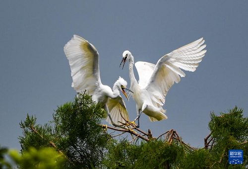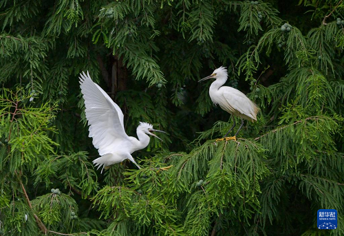 7月7日,兩只白鷺在昆明滇池海洪濕地公園嬉戲。(新華社記者 陳欣波 攝)