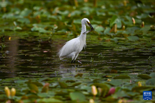 7月7日,一只白鷺在昆明滇池海洪濕地公園內(nèi)捕食。(新華社記者 陳欣波 攝)
