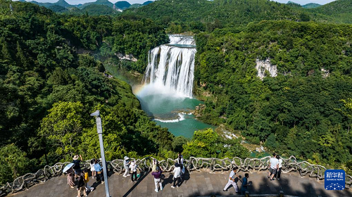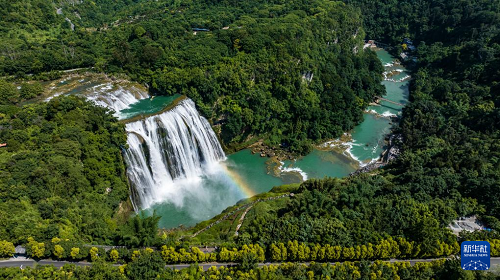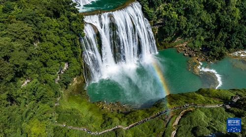 7月16日,游客在貴州省安順市黃果樹(shù)瀑布景區(qū)游覽(無(wú)人機(jī)照片)。(新華社記者 陶亮 攝)