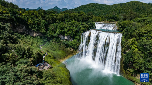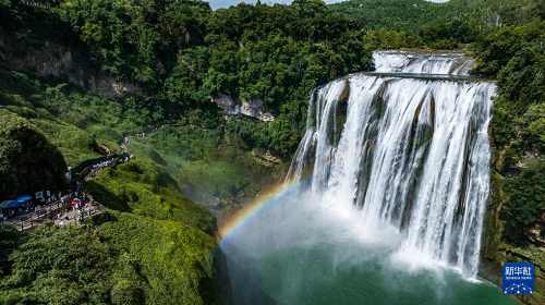 近日,位于貴州省安順市的黃果樹(shù)瀑布景區(qū)正處于夏日最佳觀賞期。黃果樹(shù)大瀑布水勢(shì)磅礴,在陽(yáng)光的照射下,瀑布前架起一道彩虹,美麗的景象吸引各地游客前來(lái)觀賞游玩。