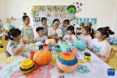 7月17日,在山東省青島市市北區(qū)第二實驗幼兒園開展的“夏天真有趣”繪畫活動中,老師指導小朋友彩繪南瓜創(chuàng)意畫。(新華社發(fā) 王海濱 攝)