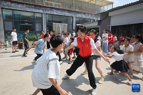 7月17日,在山東省臨沂市沂南縣辛集鎮(zhèn)彭家莊村開辦的暑期公益課堂上,來自山東財經(jīng)大學蒲公英支教團的大學生志愿者和孩子們一起玩“老鷹捉小雞”游戲。新華社發(fā)(王彥冰 攝)