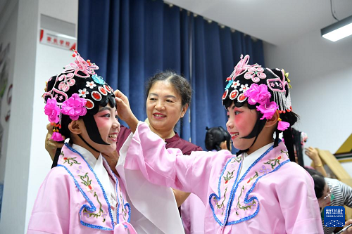 7月17日,在江西省樟樹市大橋街道金橋社區(qū)新時代文明實踐站,大橋文工團演員在給學習采茶戲的孩子整理頭飾。(新華社發(fā) 周亮 攝)