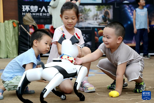 8月3日,山東省東營市的小朋友在AI智能機器人科普展上與智能機器人互動。(新華社發(fā) 劉智峰 攝)