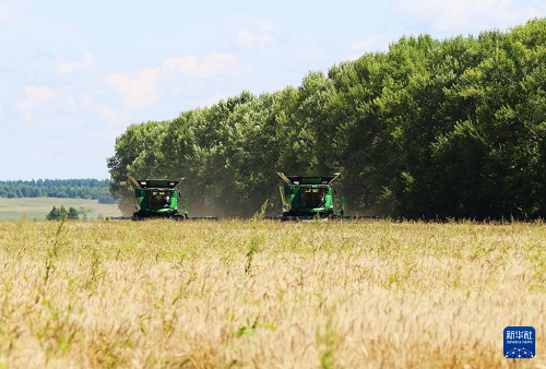 8月5日,在北大荒集團(tuán)黑龍江紅星農(nóng)場(chǎng)第二管理區(qū),大型收割機(jī)在搶收小麥。(新華社發(fā) 侯越 攝)