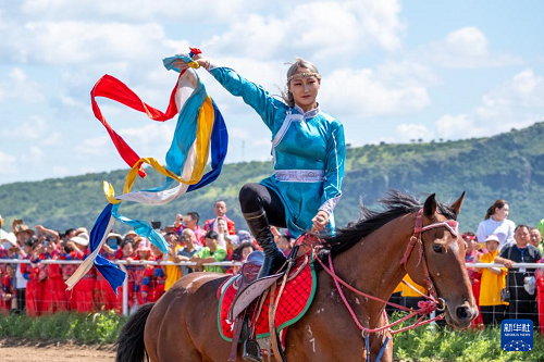 8月7日,演員在農(nóng)牧民那達(dá)慕大會(huì)上表演馬術(shù)。(新華社記者 馬金瑞 攝)