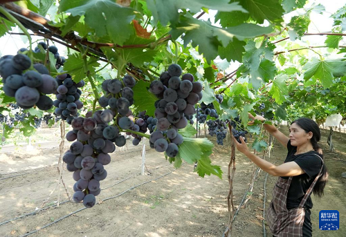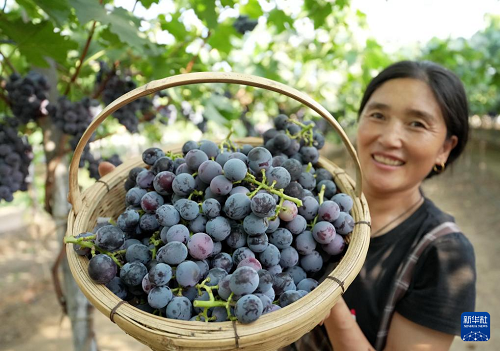8月12日,河北省盧龍縣蛤泊鎮(zhèn)鮑子溝村一家葡萄種植合作社社員在采摘葡萄。(新華社記者 楊世堯 攝)