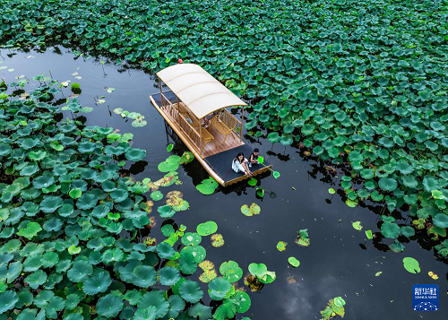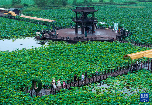 8月13日,游客在江蘇省興化市萬畝荷塘景區(qū)賞荷游玩(無人機照片)。(新華社發(fā) 周社根 攝)