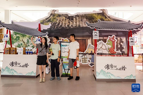 8月17日,觀眾在江蘇省泰州市萬象影城動(dòng)畫電影《浪浪山小妖怪》海報(bào)前拍照留念。(新華社發(fā) 湯德宏 攝)