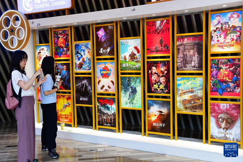 8月17日,觀眾在江蘇省無錫市一家影城的電影海報(bào)前駐足。(新華社發(fā) 還月亮 攝)