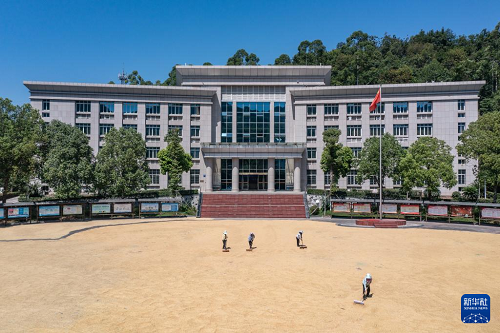 8月20日,人們?cè)谥貞c市永川區(qū)紅爐鎮(zhèn)政府廣場(chǎng)上晾曬糧食(無(wú)人機(jī)照片)。(新華社記者 黃偉 攝)