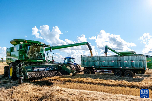 近日,位于內(nèi)蒙古呼倫貝爾市額爾古納市的呼倫貝爾農(nóng)墾拉布大林農(nóng)場(chǎng)19.22萬畝小麥迎來豐收季,當(dāng)?shù)剞r(nóng)民搶抓農(nóng)時(shí),以大規(guī)模機(jī)械化的方式開展收割、晾曬作業(yè)。