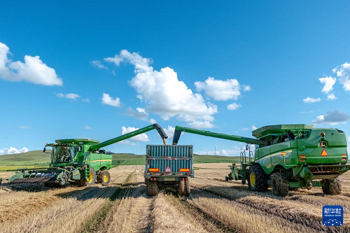 8月20日,呼倫貝爾農(nóng)墾拉布大林農(nóng)場(chǎng)的工人駕駛農(nóng)機(jī)將收獲的小麥裝車。(新華社記者 馬金瑞 攝)