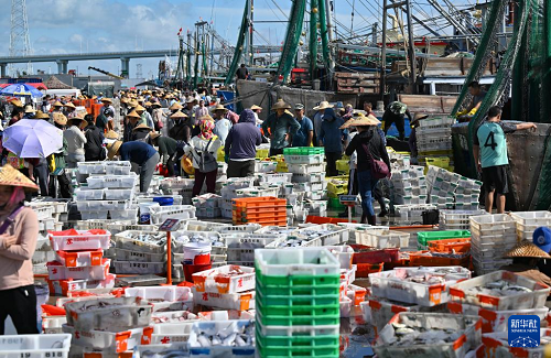?8月21日,在海南省文昌市清瀾漁港碼頭,漁民和商販在卸貨、交易。(新華社記者 郭程 攝)