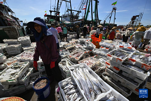 8月21日,在海南省文昌市清瀾漁港碼頭,漁民和商販在卸貨、交易。(新華社記者 郭程 攝)