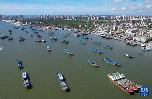 大批漁船在海南省文昌市清瀾漁港碼頭等待卸貨(8月21日攝,無人機(jī)照片)。(新華社記者 郭程 攝)