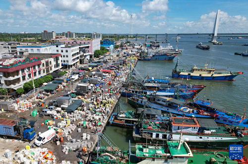 在海南省文昌市清瀾漁港碼頭,漁民和商販在卸貨、交易(8月21日攝,無人機(jī)照片)。(新華社記者 郭程 攝)