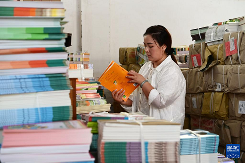8月25日,工作人員在河北新樂(lè)市新華書(shū)店倉(cāng)庫(kù)整理清點(diǎn)中小學(xué)教材,準(zhǔn)備送往各學(xué)校。(新華社發(fā) 賈敏杰 攝)