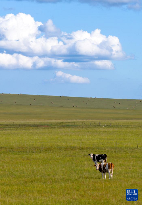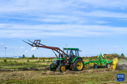 初秋時節(jié),內(nèi)蒙古呼倫貝爾大草原草色漸黃。在遼闊的草原上,牧民將豐收的牧草捆扎成卷,成群的牛羊、馬匹漫步其間,勾勒出一幅祥和美麗的秋日豐收圖景。
