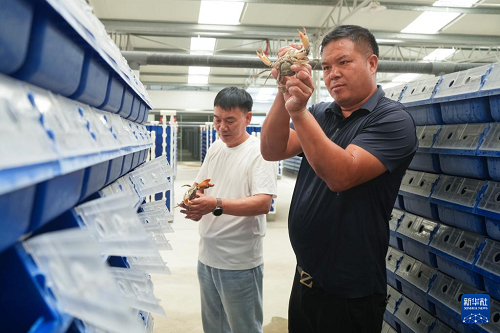 9月2日,在寧??h一市鎮(zhèn)的一家青蟹生產(chǎn)企業(yè),工作人員在暫儲青蟹的“蟹公寓”中查看其健康狀態(tài)。(新華社記者 翁忻旸 攝)