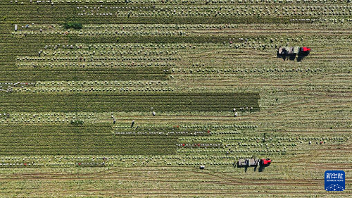 9月23日,菜農(nóng)在甘肅山丹馬場蔬菜基地里收獲蔬菜(無人機(jī)照片)。(新華社發(fā) 王超 攝)