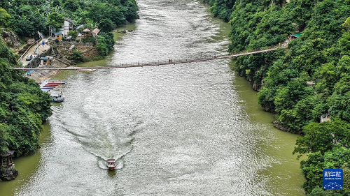 游客乘船游覽花江大峽谷景區(qū)(9月27日攝,無(wú)人機(jī)照片)。(新華社記者 陶亮 攝)