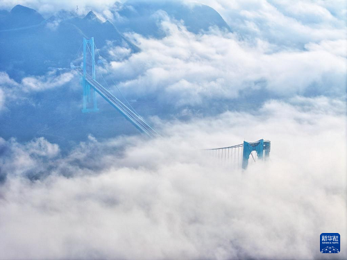 9月28日拍攝的云霧中的貴州花江峽谷大橋(無(wú)人機(jī)照片)。(新華社記者 劉續(xù) 攝)