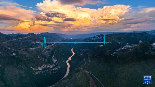 9月28日拍攝的夕陽(yáng)下的貴州花江峽谷大橋(無(wú)人機(jī)照片)。(新華社記者 楊文斌 攝)