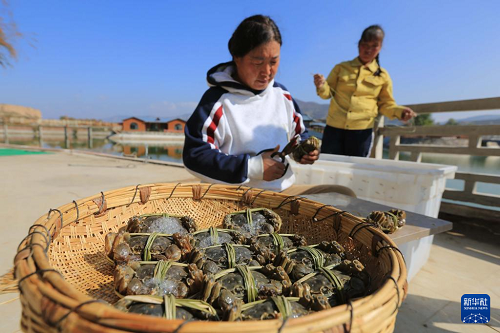 10月27日,在甘肅省定西市安定區(qū)魯家溝鎮(zhèn),工人捆扎大閘蟹。(新華社發(fā) 王克賢 攝)