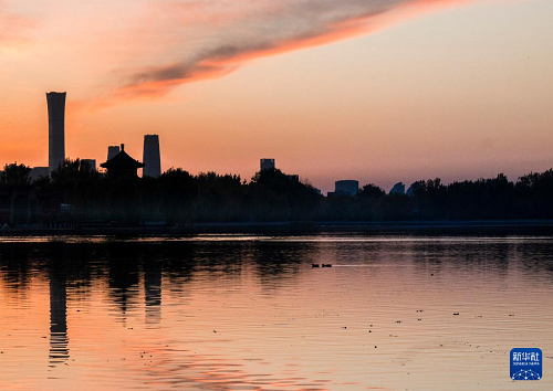 11月10日清晨,北京上空晨曦微露,霞光滿天。中國尊、望海樓等地標(biāo)建筑在晨光中與什剎海光影交錯(cuò)。