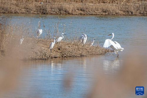 11月13日,在黃河三角洲國家級自然保護(hù)區(qū),白鷺在濕地休憩。(新華社記者 朱崢 攝)