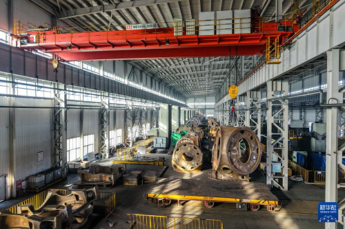 11月20日,在甘肅省酒泉經(jīng)濟(jì)技術(shù)開發(fā)區(qū)的日月重工(甘肅)有限公司機加車間,工作人員操作起重機轉(zhuǎn)運風(fēng)機輪轂(無人機照片)。(新華社記者 郎兵兵 攝)