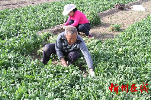 4月7日,原平市南灘村綠油油的菜地里,一對夫妻正在揮鐮收菠菜,準(zhǔn)備銷往市場。該市在落實(shí)各項惠農(nóng)政策的同時,積極推進(jìn)農(nóng)業(yè)結(jié)構(gòu)調(diào)整,將簡單粗放型農(nóng)業(yè)向精細(xì)高效型農(nóng)業(yè)提升,使農(nóng)民收入成倍翻番,真正讓農(nóng)民嘗到了甜口。(褚震 攝)