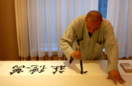 7月5日下午,筆者在五臺(tái)山金都山莊偶遇精彩一幕。只見數(shù)十人屏氣凝神,圍觀一行腳僧現(xiàn)場揮毫潑墨。行云流水之際,一幅幅書法作品躍然紙上。