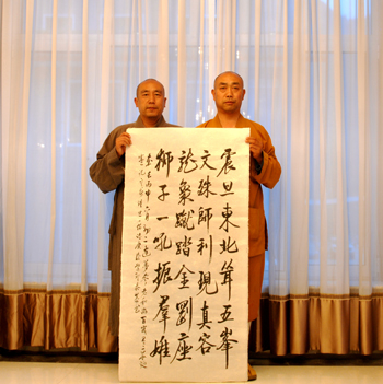 利用閑暇,筆者與行腳僧進(jìn)行了簡單溝通,了解到法師來自廣東省韶關(guān)云門山大覺禪寺,法名圣泰,是云門宗第十五代弟子,酷愛書法,且仰慕五臺(tái)山多時(shí),此行特用且行且書的方式了卻多年朝圣心愿。
