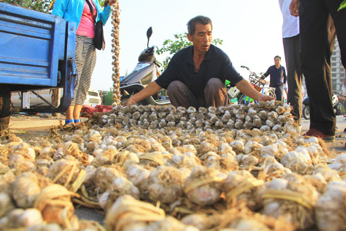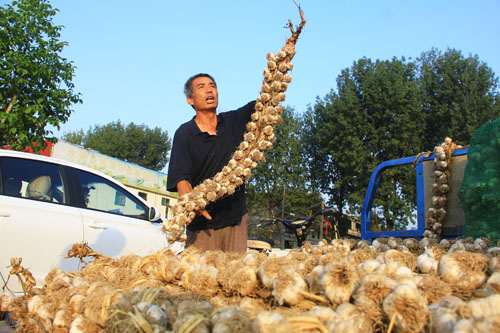 7月30日,原平市陽房村蒜農(nóng)正在農(nóng)產(chǎn)品市場(chǎng)銷售紫皮蒜。原平紫皮蒜是當(dāng)?shù)氐钠放妻r(nóng)產(chǎn)品,盛產(chǎn)于滹沱河沿岸的新原鄉(xiāng)和西鎮(zhèn)鄉(xiāng),不僅是調(diào)味佳品,而且食用具有藥用價(jià)值,省內(nèi)外客商慕名而來購(gòu)買,深受歡迎。(吉建平 攝)