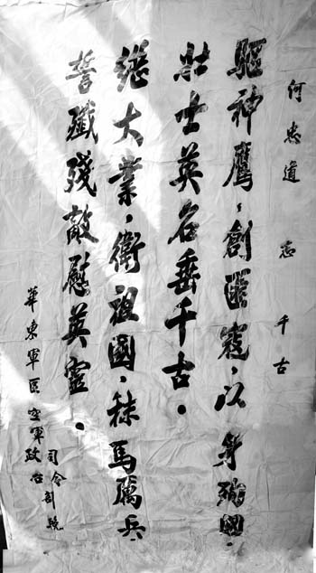 何忠道的犧牲,引起了整個空軍系統(tǒng)的震憾,人民空軍舉行了隆重的追悼大會??哲姍C關(guān)、華東軍區(qū)、生前所在部隊機關(guān)、戰(zhàn)友送了幾十幀挽幛。空軍司令員劉亞樓、副司令員常乾坤、副政委吳法憲、參謀長王秉璋聯(lián)名敬獻的挽幛上書:“殲滅美國侵略者,堅決保衛(wèi)祖國領空,為何忠道同志復仇!”華東軍區(qū)司令部、政治部敬獻的挽幛上書:“驅(qū)神鷹,創(chuàng)飛寇,以身殉國,壯士英名垂千古。創(chuàng)大業(yè),衛(wèi)祖國,秣馬厲兵,誓殲殘敵慰英靈?!?/p>