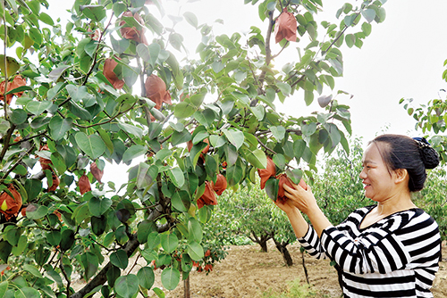 走進(jìn)梨園,記者看到,一排排梨樹枝粗葉茂,大大小小的套袋酥梨掛滿了枝頭,等待著人們的采摘。“以前就是每家有那么幾棵樹,零零散散不成氣候?,F(xiàn)在形成了規(guī)?;N植,在市場上也打出了品牌?!蓖跫t麗指了指周邊一眼看不到盡頭的梨園,介紹說這都是同村的村民種植的。為了符合人們現(xiàn)在純天然、綠色、無污染的消費需求,所有的梨在剛成形時就被套上了袋子,不再打農(nóng)藥?!艾F(xiàn)在各家各戶都開始采摘了,再過幾天,就會有各地來的經(jīng)銷商統(tǒng)一收購。”