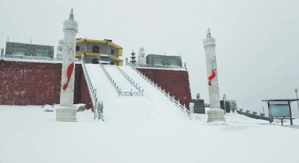 此次降雪主要分布在五臺(tái)山平均海拔2800米以上的五座臺(tái)頂。因?yàn)榕_(tái)頂與臺(tái)懷腹地海拔相差1000米以上,所以時(shí)有“臺(tái)懷飄雨臺(tái)頂雪”的奇觀出現(xiàn)。東臺(tái)頂亦名望海峰,《清涼山志》載:“蒸云寢壑,爽氣澄秋,東望明霞,若陂若境,即大海也。亦見(jiàn)滄瀛諸州,因以為名?!蓖7迨俏迮_(tái)山觀日出的絕佳位置。7日一大早,東方不見(jiàn)明霞,整個(gè)東臺(tái)頂銀裝素裹,霧靄茫茫,天籟梵音依舊,在圣潔的佛國(guó)仙境踏雪而行,更深切地感受人生一步一個(gè)腳印的意義。(本報(bào)記者 馬卓超 通訊員 覺(jué)一 攝影報(bào)道)