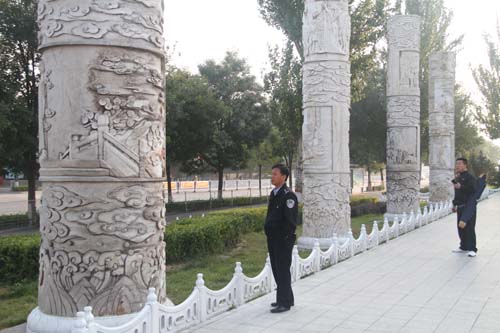 10月9日,原平市民在范亭文體廣場聚落的柱式雕塑前觀看愛國名將續(xù)范亭、東晉名士郝隆等16位名人紀(jì)念雕像。近年來,該市著力打造文化強市,利用柱式雕塑像繪制歷史文化名人、抗日英雄等群體形象,營造濃濃的文化氛圍。(褚震 攝)