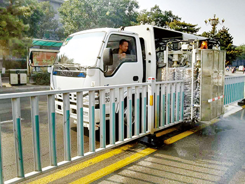 交通護(hù)欄可為市民、車(chē)輛出行提供安全保障,可人工清洗護(hù)欄工作耗時(shí)耗力,還存在安全隱患。新購(gòu)置的護(hù)欄清洗車(chē)通過(guò)伸縮刷子以及車(chē)載水箱噴出的水流,完成護(hù)欄清洗,工作效率遠(yuǎn)遠(yuǎn)高于人工清洗,省時(shí)又省力,效果還明顯。圖為清洗車(chē)正在對(duì)城區(qū)交通護(hù)欄進(jìn)行清洗。(張志遠(yuǎn) 孫明 攝)