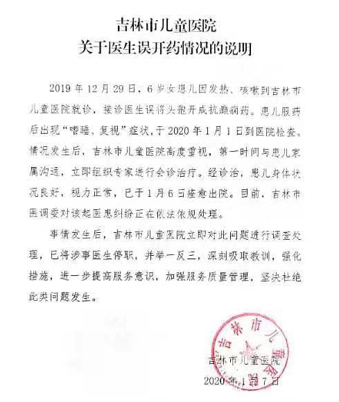 人民網北京1月8日電 1月7日,吉林市兒童醫(yī)院在其網站發(fā)布關于醫(yī)生誤開藥情況的說明稱,2019年12月29日,一名6歲女患兒因發(fā)熱、咳嗽到吉林市兒童醫(yī)院就診,接診醫(yī)生誤將頭孢開成抗癲癇藥造成患兒出現“嗜睡、復視”的癥狀。經專家會診治療,患兒身體狀況良好,視力正常,已于1月6日痊愈出院。