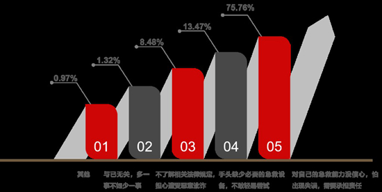 廉思課題組的報告顯示,缺乏急救知識是大學(xué)生不愿參與現(xiàn)場急救的原因之一。當(dāng)遇到呼吸停止的無意識人員時,68.33%的被調(diào)查者選擇“撥打120,并在原地等候”,能“立即上前查看,并采取急救措施”的只有25.76%。