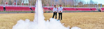 在哈爾濱工業(yè)大學(xué)體育場(chǎng),航模協(xié)會(huì)的學(xué)生操控航模點(diǎn)火發(fā)射。新華社發(fā)