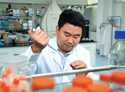 中國科學(xué)院天津工業(yè)生物技術(shù)研究所研究員蔡韜在進(jìn)行人工合成淀粉項(xiàng)目實(shí)驗(yàn)操作。馮毅飛攝
