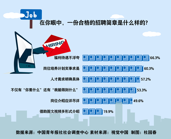 日前,中國青年報(bào)社社會(huì)調(diào)查中心聯(lián)合問卷網(wǎng)(wenjuan.com),對1334名應(yīng)屆大學(xué)生進(jìn)行的一項(xiàng)調(diào)查顯示,在他們眼中,一份合格的招聘簡章,首先是福利待遇不浮夸(66.3%),其次是崗位培養(yǎng)計(jì)劃實(shí)事求是(60.3%),再次是人才需求明確具體(57.2%)。