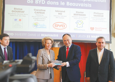 本報法國博韋3月23日電 (記者曹鵬程、殷新宇、李鶴)中國企業(yè)比亞迪23日在此間宣布,向法國上法蘭西大區(qū)投資1000萬歐元,成立電動汽車組裝廠。比亞迪歐洲區(qū)總經(jīng)理何一鵬、上法蘭西大區(qū)議會主席格扎維埃·貝特朗、博韋市市長卡洛琳娜·卡耶出席了新聞發(fā)布會。