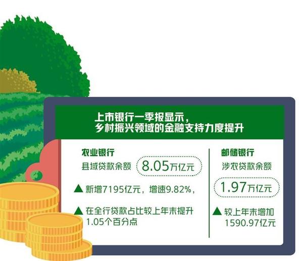 近日,各家上市銀行一季報(bào)先后披露完畢。從公開數(shù)據(jù)看,中國農(nóng)業(yè)銀行、中國郵政儲(chǔ)蓄銀行等在鄉(xiāng)村振興領(lǐng)域的金融支持力度持續(xù)提升。其中,農(nóng)業(yè)銀行縣域貸款余額達(dá)8.05萬億元,新增7195億元,增速9.82%,增量創(chuàng)歷史同期新高,在全行貸款占比較上年末提升1.05個(gè)百分點(diǎn)。郵儲(chǔ)銀行涉農(nóng)貸款余額1.97萬億元,較上年末增加1590.97億元;建成信用村38.69萬個(gè),評(píng)定信用戶超千萬戶,主動(dòng)授信白名單客戶貸款本年凈增366.20億元。