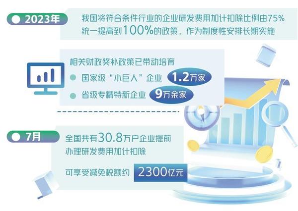 “為切實(shí)保證這一新的惠企政策落實(shí)到位,稅務(wù)部門(mén)依托稅收大數(shù)據(jù)篩選符合條件的企業(yè),定向開(kāi)展政策精準(zhǔn)推送和宣傳輔導(dǎo),確保企業(yè)‘知曉政策’;會(huì)同科技部門(mén)及時(shí)發(fā)布《研發(fā)費(fèi)用加計(jì)扣除政策執(zhí)行指引2.0》,細(xì)化政策口徑,確保企業(yè)‘會(huì)用政策’;第一時(shí)間優(yōu)化升級(jí)征管系統(tǒng),改進(jìn)電子稅務(wù)局功能,讓納稅人‘足不出戶(hù)’即可快捷辦理,確保企業(yè)‘用好政策’?!眹?guó)家稅務(wù)總局新聞發(fā)言人、辦公廳主任黃運(yùn)介紹。從7月份政策落實(shí)情況看,全國(guó)共有30.8萬(wàn)戶(hù)企業(yè)提前辦理研發(fā)費(fèi)用加計(jì)扣除,可享受減免稅額約2300億元。