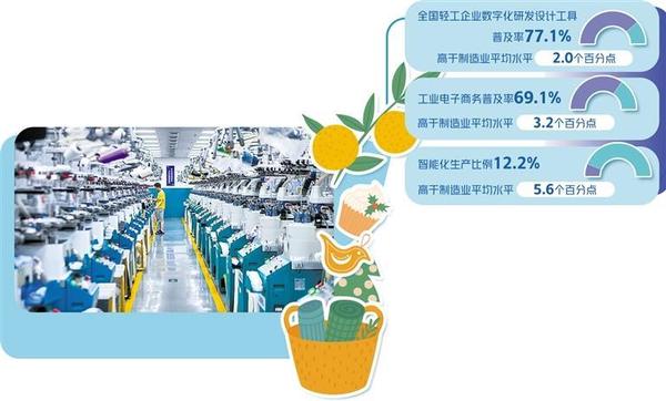 “以輕工業(yè)為例,全國(guó)輕工企業(yè)數(shù)字化研發(fā)設(shè)計(jì)工具普及率77.1%,工業(yè)電子商務(wù)普及率69.1%,分別高于制造業(yè)平均水平2.0個(gè)和3.2個(gè)百分點(diǎn)?!蓖跣⒀笳f。